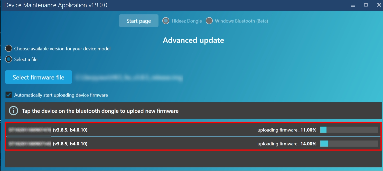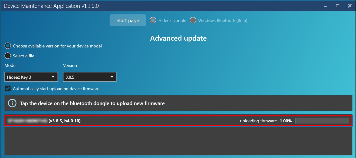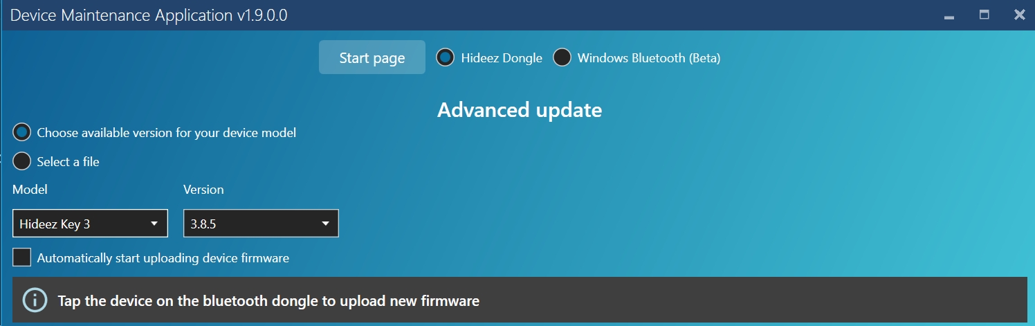 Запустіть файл Device Maintenance Application.exe. Виберіть опцію Розширеного оновлення. Якщо ви хочете оновити прошивку за допомогою донгла, виберіть Hideez dongle, якщо ви хочете оновити прошивку через внутрішній Bluetooth - виберіть Windows Bluetooth (Beta).