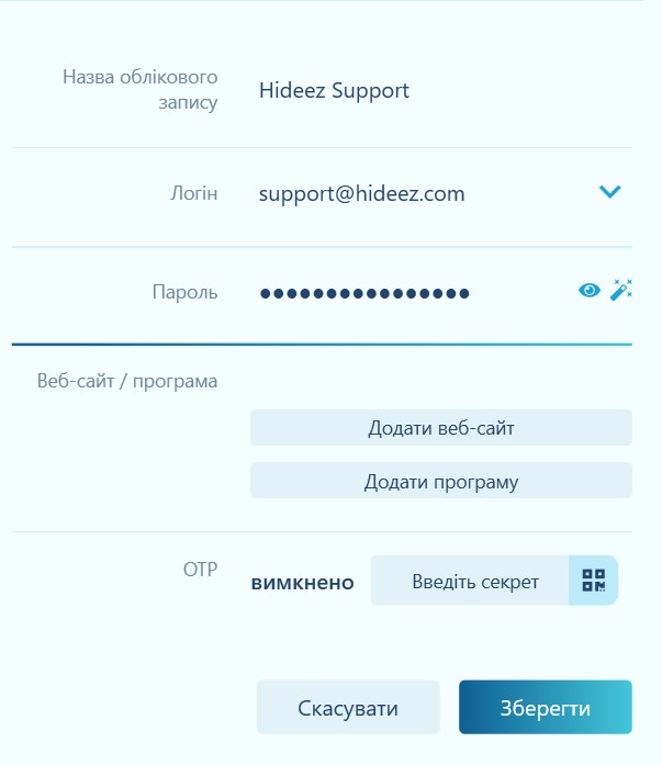 Облікові записи, які ви створюєте безпосередньо в Hideez Client, бачитимете лише ви. Адміністратор HES не побачить їх і не зможе з ними жодним чином взаємодіяти.