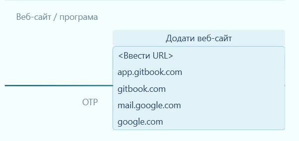 Веб-сайт / додаток – адреси веб-сайтів і програм, де можна використовувати цей акаунт. Щоб додати адресу сайту, натисніть кнопку Додати веб-сайт. Скористайтеся списком що спадає, щоб вибрати одну з адрес, які ви використовували раніше, або введіть нову і після введення адреси натисніть клавішу Enter або символ підтвердження. Натисніть символ кошика, щоб видалити введену адресу.