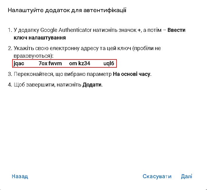 OTP секрет — тут можна скопіювати секретний ключ, на основі якого генеруються одноразові паролі. Як правило, такий ключ відображається у вигляді QR-коду на екрані комп’ютера та призначений для сканування телефонним застосунком. Наприклад, ось як виглядає одноразовий пароль для облікового запису Google: