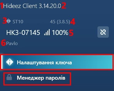Назва (1) і версія програми (2) Менеджер паролів - пункт меню для роботи з менеджером паролів