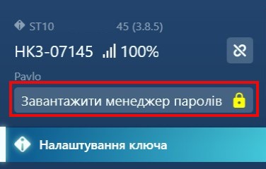 Сховище завантажено - індикатор завантаження даних з ключа. Зелений індикатор означає, що ключ авторизований, дані завантажені. Доступний пункт меню - Менеджер паролів. Червоний індикатор означає, що ключ не пройшов авторизацію або що нові паролі з сервера HES завантажуються на ключ.