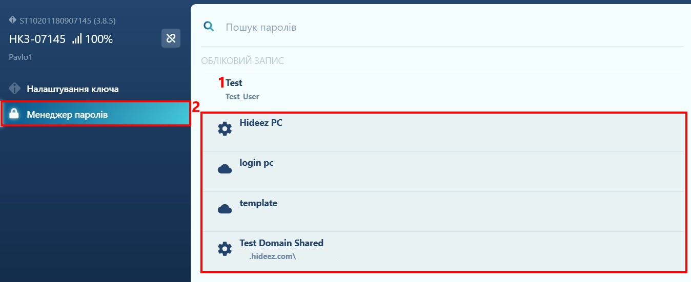 Облікові записи, які створено безпосередньо у Hideez Client (1), користувач може видаляти та редагувати. Біля таких записів, ніяких зображень символів не має.