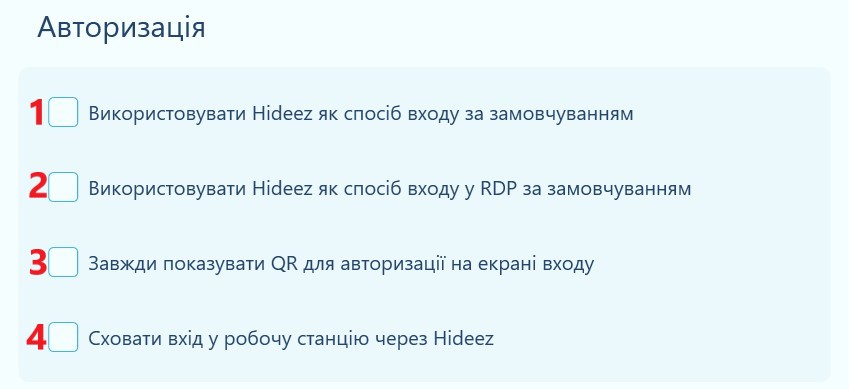 4 - Сховати вхід у робочу станцію через Hideez. Увімкнення цієї опції сховає вхід у робочу станцію за допомогою Hideez і ви більше не зможете зайти в неї за допомогою ключів і мобільного застосунку. Ви можете входити у робочу станцію за допомогою облікових даних локального користувача.