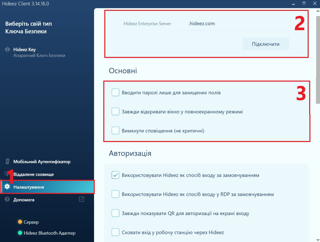 Ви можете встановити адресу серверу Hideez Enterprise у полі 2.