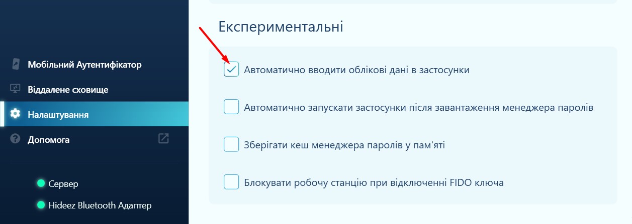 Відкрийте сторінку налаштувань Hideez Client, прокрутіть вниз до розділу Експериментальні та виберіть параметр Автоматично вводити облікові дані в застосунки.