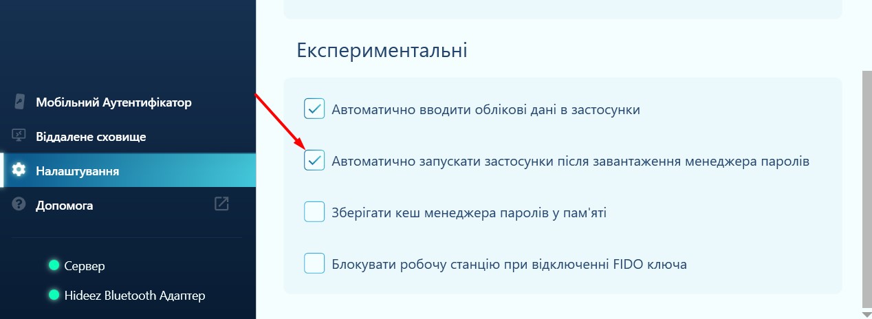 Відкрийте сторінку Налаштувань Hideez Client, прокрутіть вниз до розділу Експериментальні та виберіть параметр Автоматично запускати застосунки після завантаження менеджера паролів