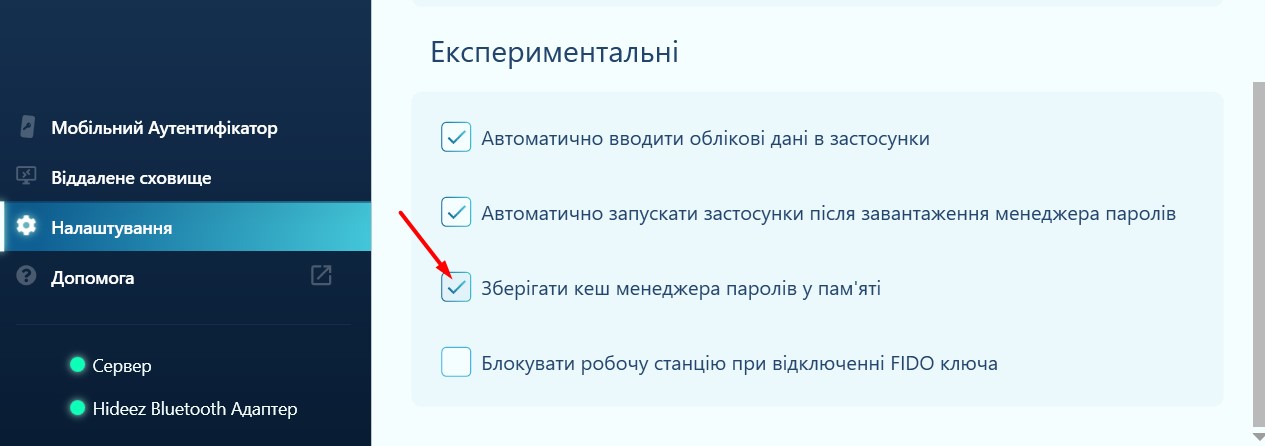 Увімкнення цього параметра дозволяє програмі Hideez Client кешувати менеджер паролів у пам’яті під час сеансу. Коли апаратне сховище від’єднується від робочої станції під час одного сеансу клієнта, його сховище паролів залишається кешованим у пам’яті програми. Тому програмі не потрібно знову завантажувати всі дані кожного разу, коли ключ під’єднується до Hideez Client, сховище готове до використання миттєво.
