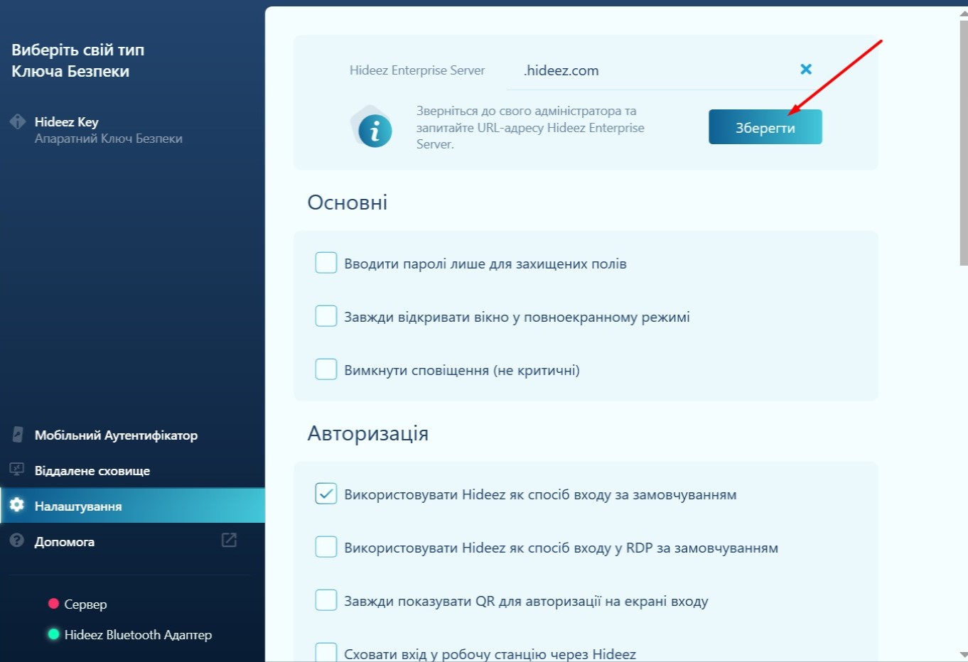 Встановіть Hideez Client на віддалену робочу станцію. Введіть адресу HES і натисніть Зберегти. Затвердіть цей ПК на сервері HES.