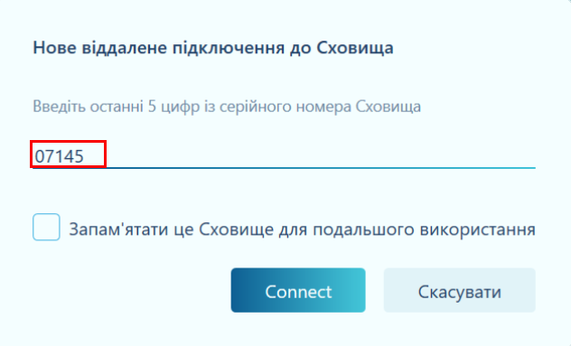 Введіть останні 5 цифр із серійного номера ключа Hideez та натисніть кнопку «Підключити». Позначте «Запам’ятати це сховище для подальшого використання», щоб зберегти цей ключ для майбутнього використання на цьому комп’ютері.