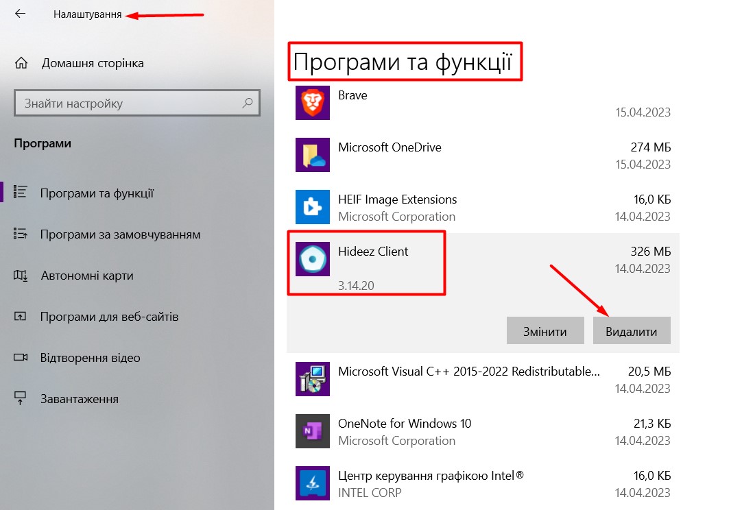 2. Оберіть зі списку програм **Hideez Client** і натисніть **Видалити**.
