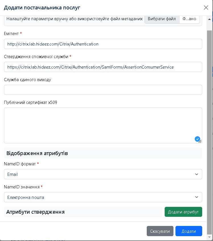 Ствердження споживчої служби - AssertionConsumerService з Citrix StoreFront https://citrix.lab.hideez.com/Citrix/Authentication/SamlForms/AssertionConsumerService
