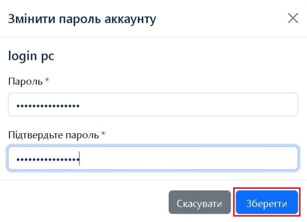 Змініть пароль облікового запису (необхідно ввести новий пароль і підтвердити його повторним введенням, поточний пароль знати не потрібно) і натисніть кнопку Зберегти. Change the account password (you should enter a new password and confirm it by re-entering, there is no need to know the current password) and click Save.