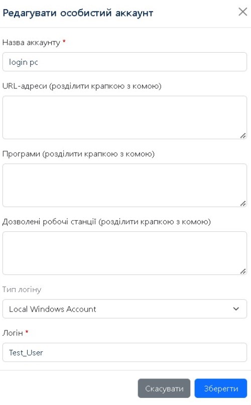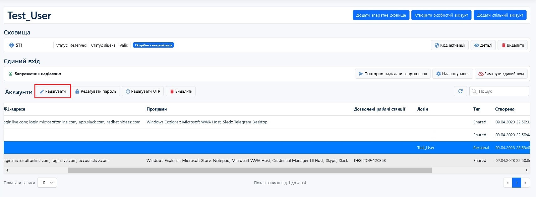 Доступні дії з особистими акаунтами: - Редагування - Зміна пароля - Редагування One Time Password - Видалення