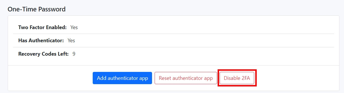 Щоб вимкнути двофакторну автентифікацію на сервері HES, перейдіть на вкладку «Профіль». У розділ «Одноразовий пароль» натисніть «Вимкнути 2FA».