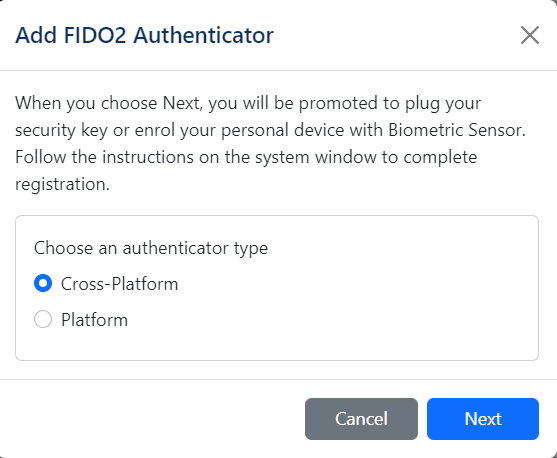 Якщо функцію «Дозволити автентифікатори платформи» ввімкнено, ви можете вибрати тип ключа безпеки, який реєструєте для користувача (за замовчуванням він кросплатформний):