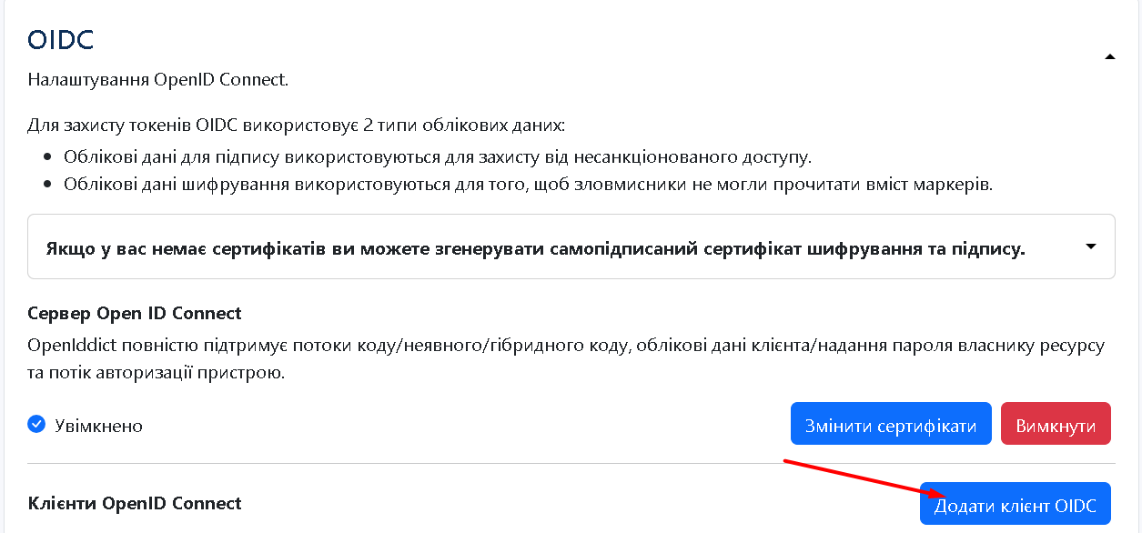 Налаштування OpenID Connect можна встановити у розділі OIDC.