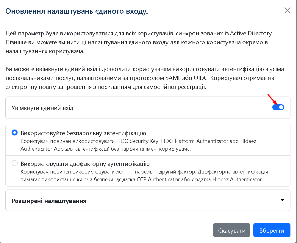 Цей параметр застосовується до всіх користувачів, синхронізованих із Active Directory. Під час імпорту користувачів із Active Directory для кожного з них буде автоматично увімкнено SSO-вхід у вебсервіси. Також на електронну пошту кожного співробітника буде надіслано запрошення на сервер Hideez із можливістю вибору методу автентифікації.