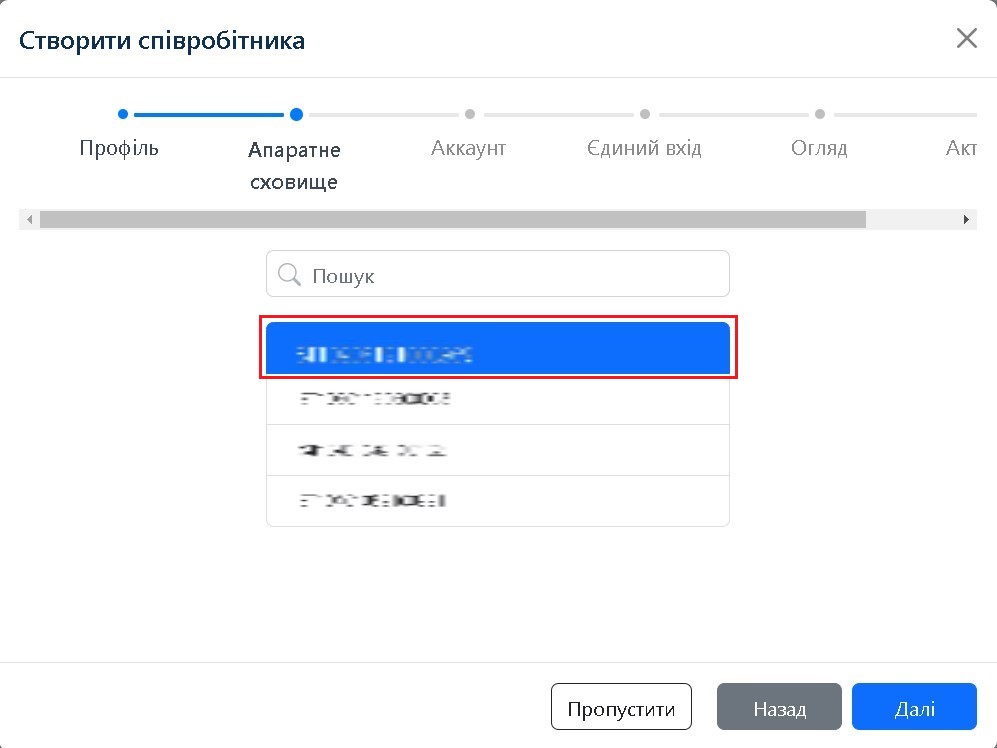 На цьому кроці ви можете призначити ключ Hideez працівнику. Ви можете вибрати тільки з пристроїв у статусі Ready. Ви можете пропустити цей крок на цей момент, якщо ви не впевнені. Просто натисніть Пропустити.