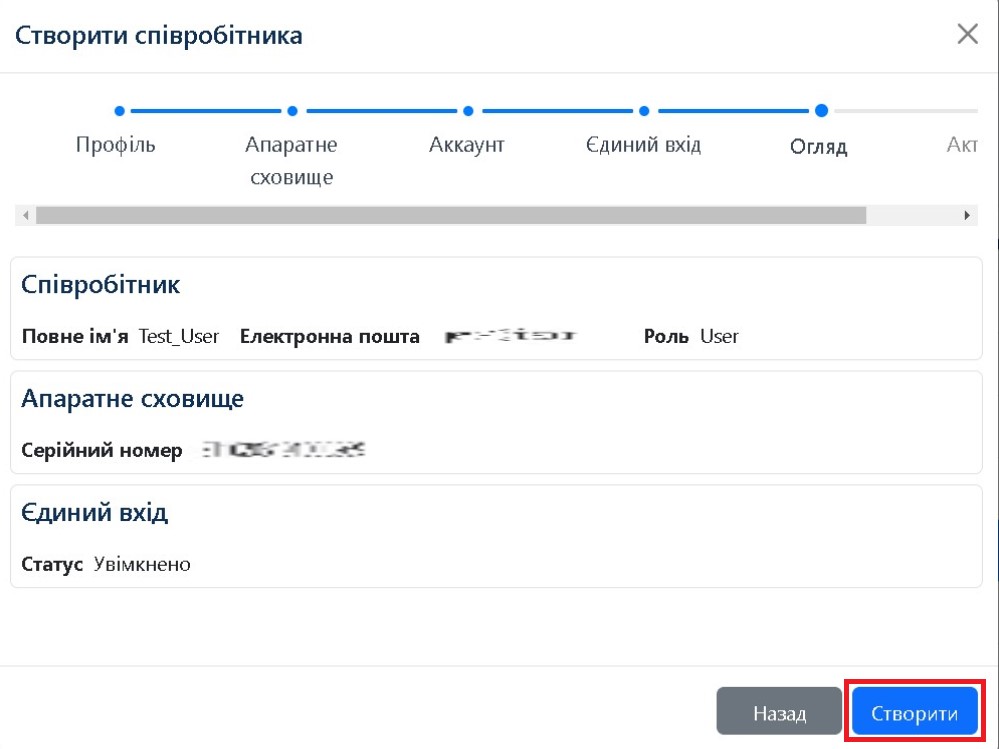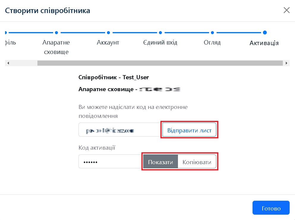Після цього кроку буде створено Співробітника. На наступному кроці потрібно надати користувачеві код активації пристрою (якщо ви прив’язали сховище до користувача на кроці "Апаратне сховище").