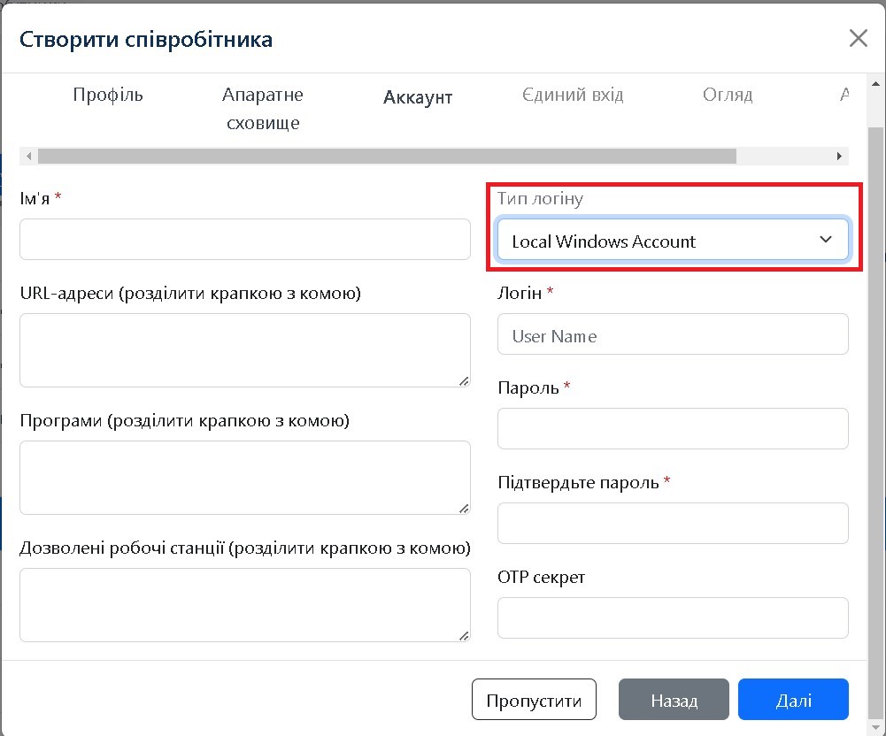 На цьому кроці ви можете, наприклад, додати особистий обліковий запис для розблокування робочої станції. Виберіть тип облікового запису (локальний/доменний/Windows/Azure AD) і додайте всі необхідні дані. Ви можете пропустити цей крок на цей момент, якщо ви не впевнені. Просто натисніть Пропустити.