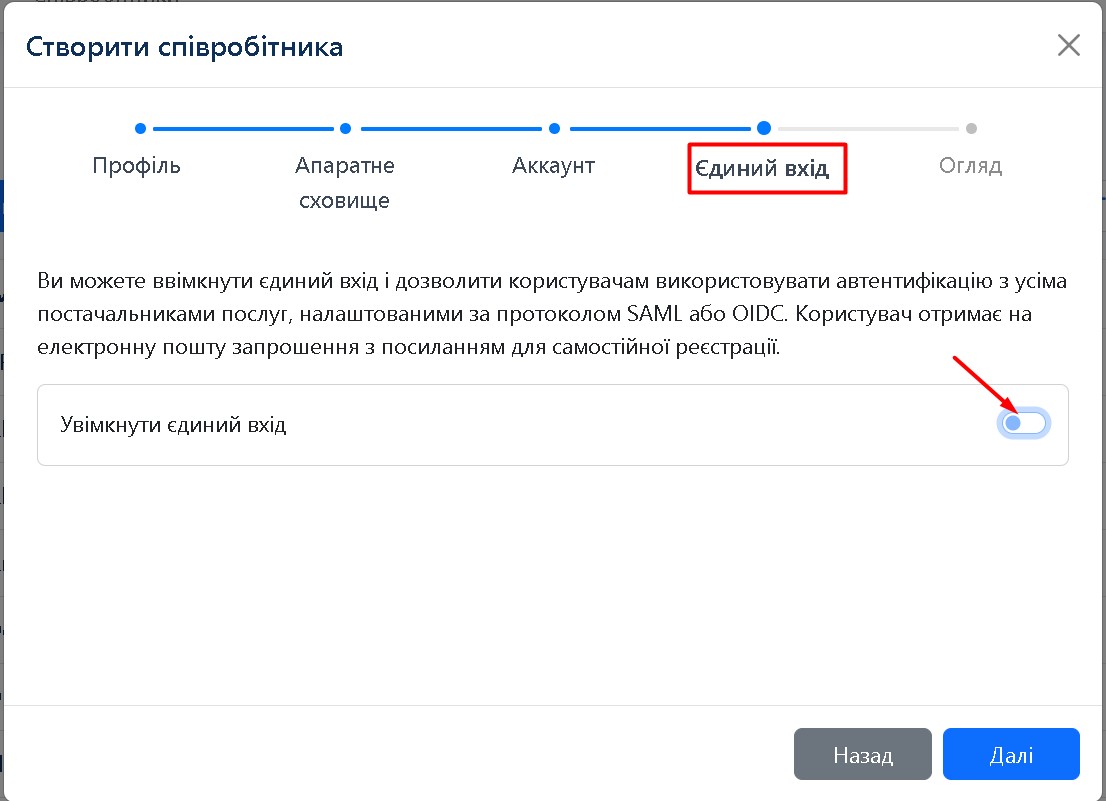 На цьому кроці ви можете ввімкнути опцію Єдиного Входу (Single Sign On), якщо на вашому сервері налаштовано протокол SAML і увімкнена двофакторна автентифікація.