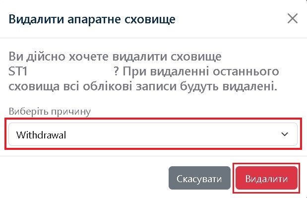 Виберіть причину видалення (withdrawal/broken) і натисніть Видалити.