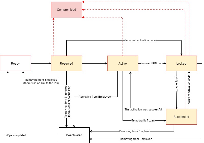 Deactivated - ключ деактивовано. Причинами деактивації ключа можуть бути: - Withdrawal - вилучення ключа у співробітника (наприклад, при його звільнені); - Broken - ключ повернуто через його поломку;