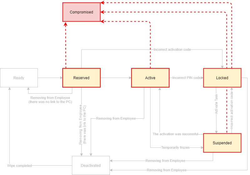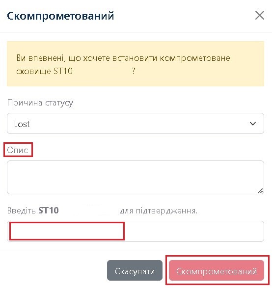У зв'язку з незворотністю цієї дії, ви повинні підтвердити свій намір. Виберіть причину зі списку, введіть серійний номер пристрою та натисніть Скомпрометований.