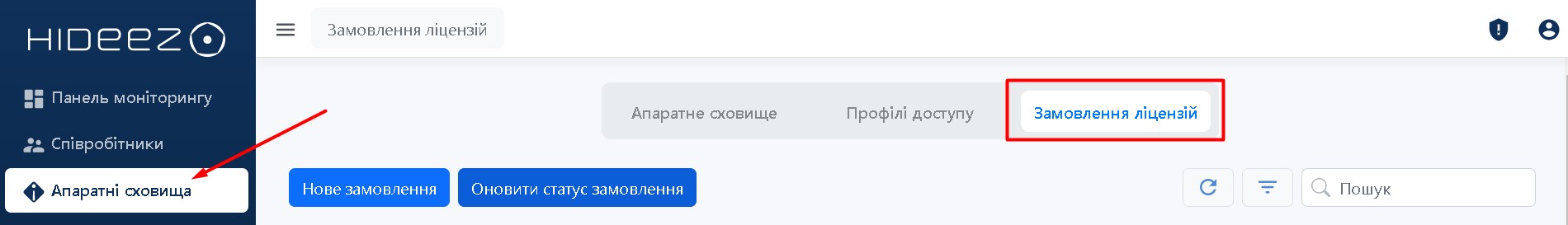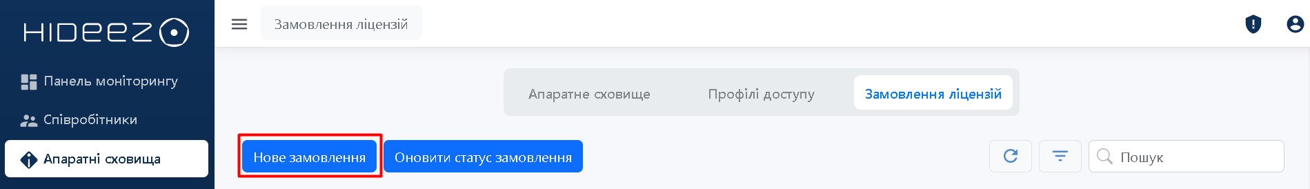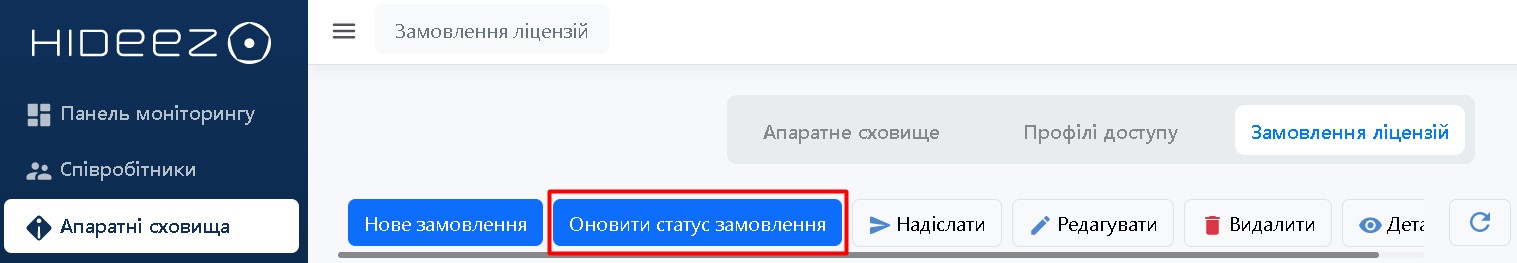 Перейдіть у розділ Апаратні сховища, далі на вкладку Замовлення ліцензій, щоб отримати нові ліцензії або поновити наявні.