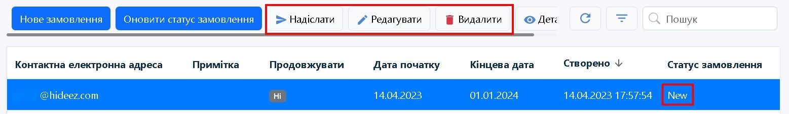 Після створення замовлення воно відображається у списку в статусі New. У цьому статусі ви можете скасувати замовлення, переглянути його або відправити на обробку.