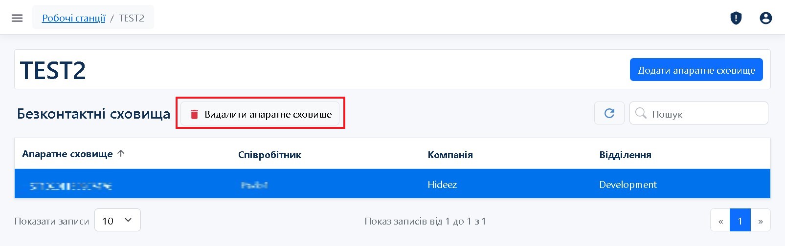 Клацніть рядок із потрібним ключем Hideez і натисніть кнопку Видалити апаратне сховище.