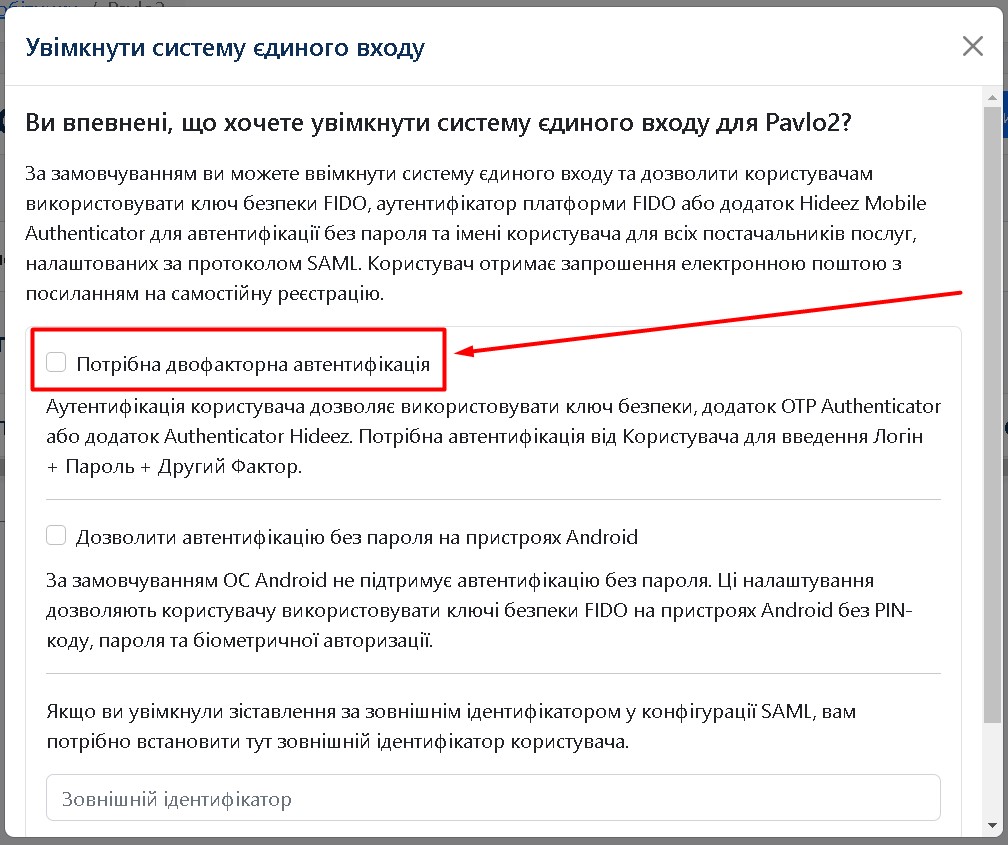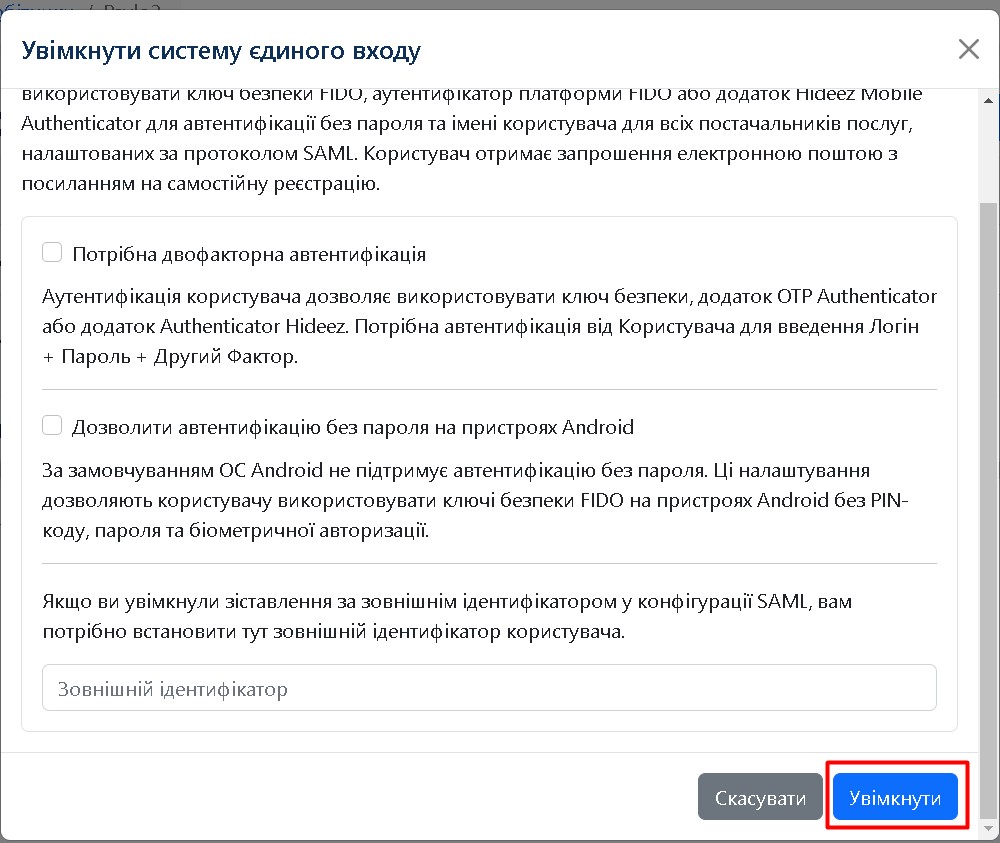 Якщо ви хочете вимагати Hideez Authenticator як другий фактор, установіть прапорець «Обов’язкова двофакторна автентифікація», а потім натисніть кнопку «Увімкнути».