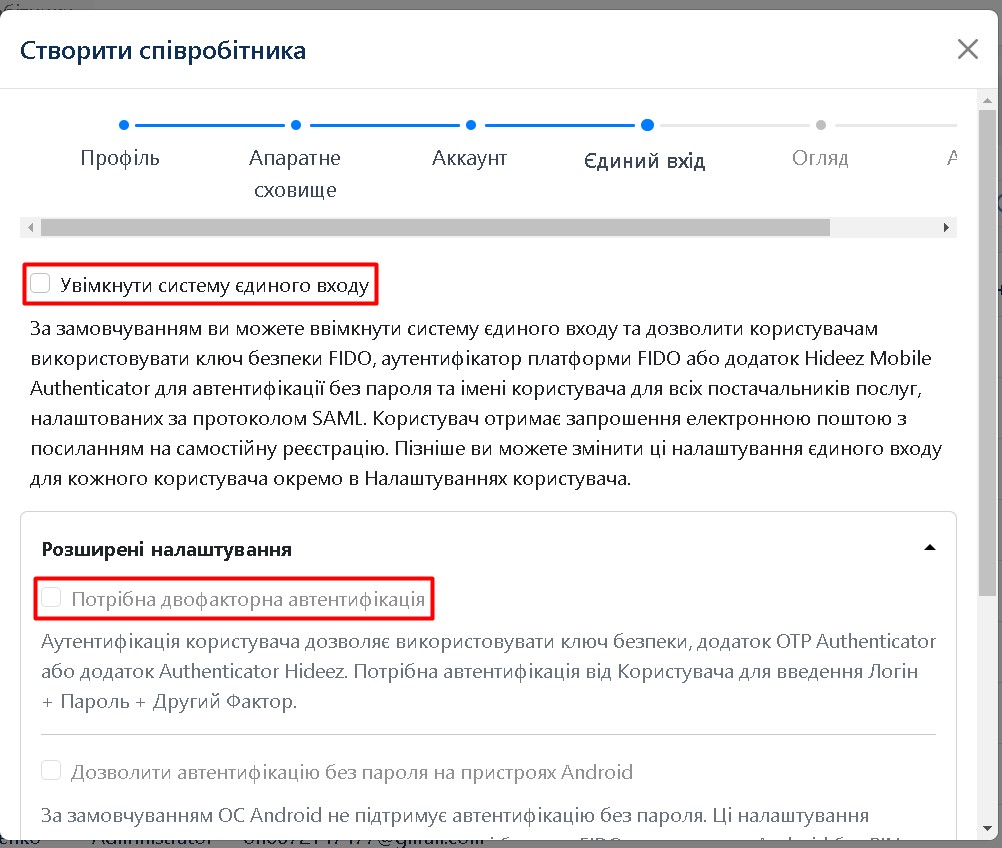 Також ви можете увімкнути SSO та Second-factor для користувача під час створення співробітника на кроці "Єдиний вхід":