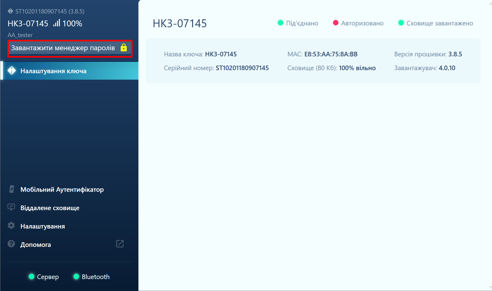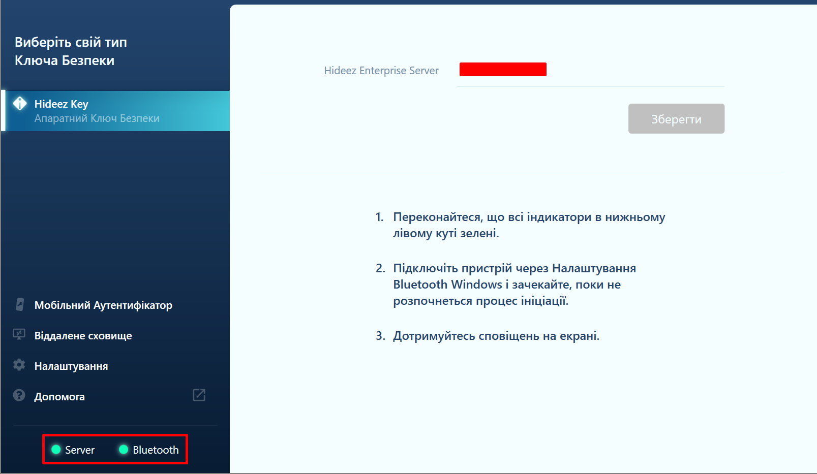 Будь ласка, перевірте чи індикатори Server та Bluetooth світяться зеленим.