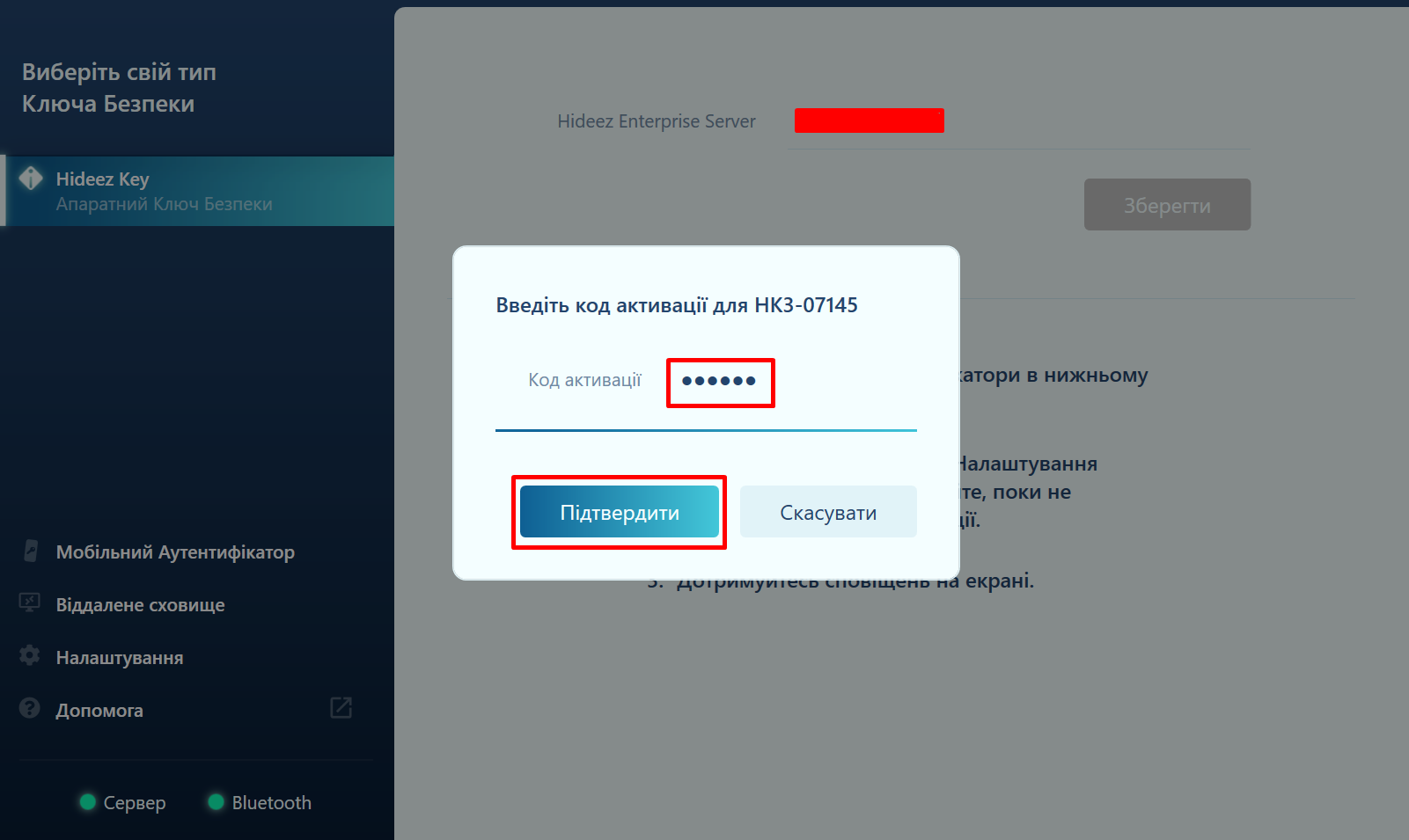 Одночасно з ключем Hideez адміністратор повинен надати вам код активації. Його можна надіслати електронною поштою або повідомити іншим способом. Введіть цей 6-значний цифровий код у поле коду активації та натисніть Підтвердити.
