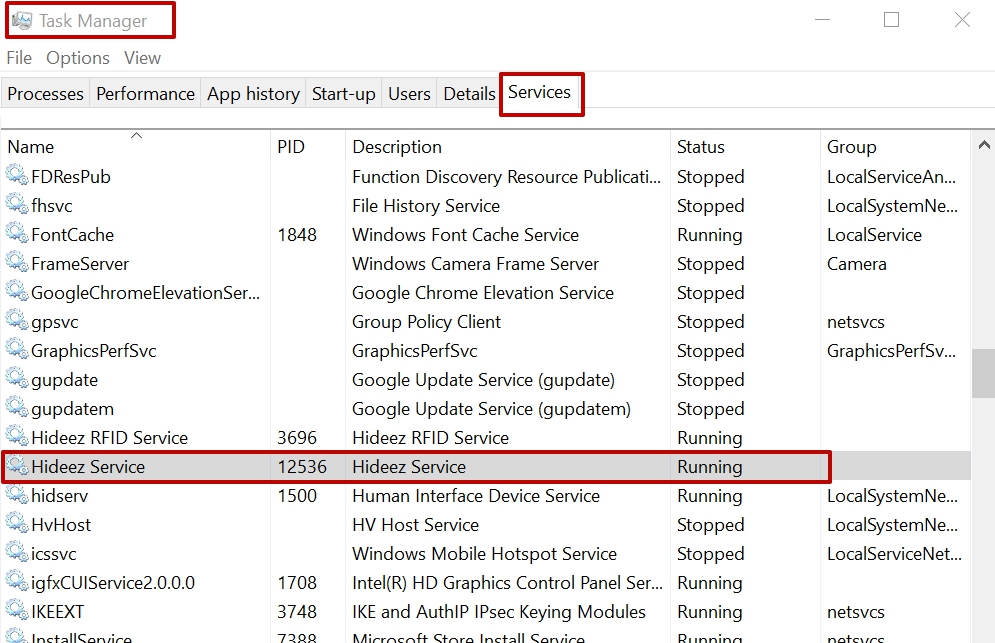 Клацніть правою кнопкою миші на рядку з Hideez Service і натисніть Зупинити.