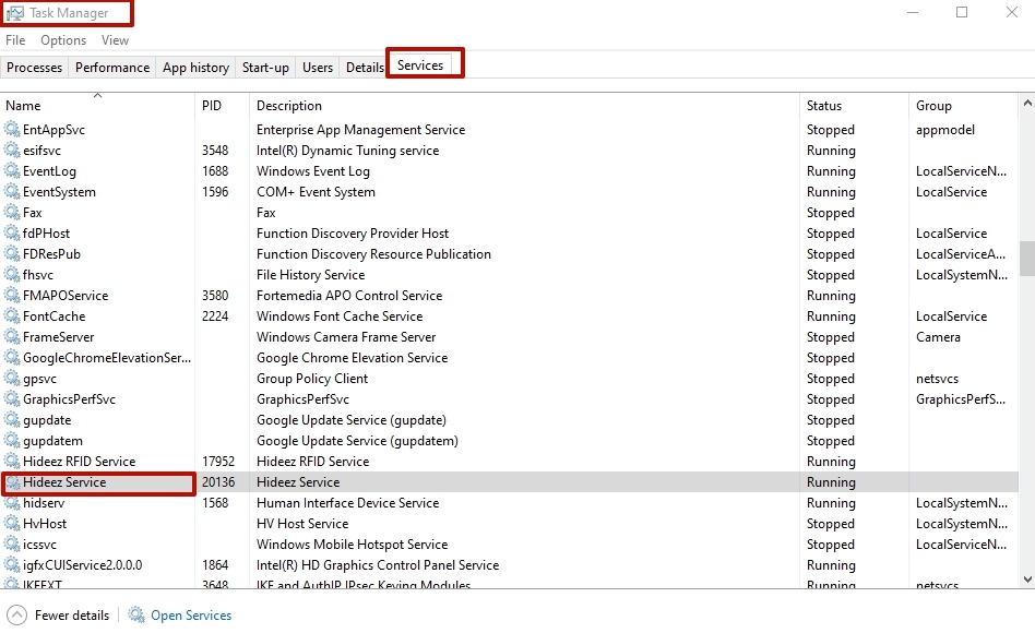 b) Перевірте, чи працює служба Hideez, перезапустіть її.